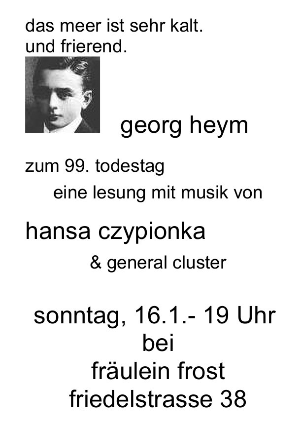 - Lesung "Georg Heym" mit Musik bei 30 Tage Kunst am 19.11.2011, gelesen von Hansa, Gesang Nathalie, Instrumente Paul, Hanno, Stefan, Hansa